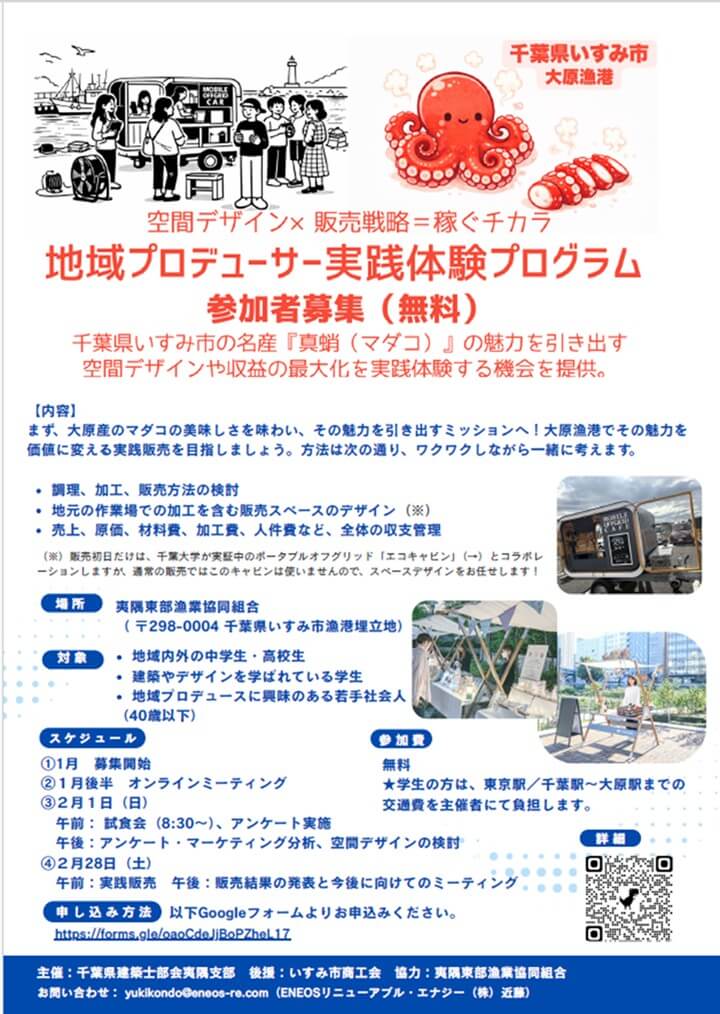 2月1日(日)、大原産のモノや地域の魅力をもっと引き出すための新しい取り組みがスタートします。千葉大学の学生たちと一緒に、地域の“魅力”を“価値”へと育てていくチャレンジです。「何かワクワクすることに関わってみたい」「地域の未来づくりに興味がある」そんな方にぴったりの場。地元・地元以外の中高生、建築やデザインを学ぶ学生、そして地域プロデュースに関心のある40歳以下の社会人も大歓迎。一緒に、大原の新しい可能性を見つけてみませんか。